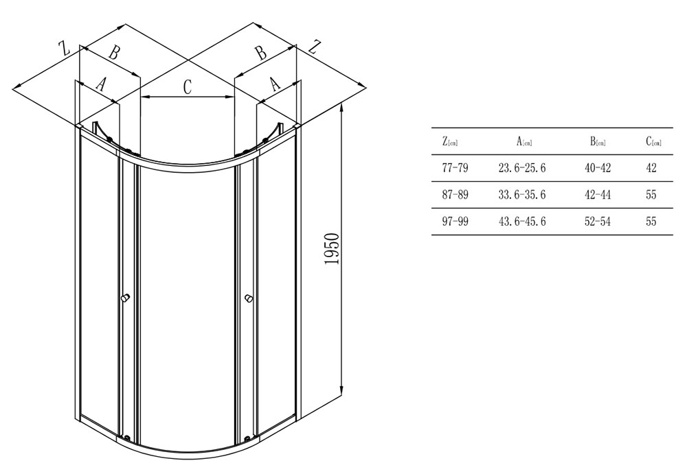 Ouverture centrale par 2 parois coulissantes sur 2 parois fixes. Profilés en aluminium finition noir mat. Fermeture des portes magnétique.