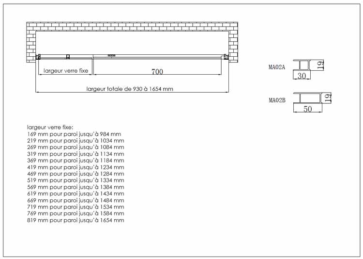 Vos dimensions sont hors normes? La cabine de douche pivotante et fixe est la solution sur mesure idéale. Les profilés de compensation chromé s’accorderont parfaitement avec la robinetterie de la collection Châtelet chromé. Verre trempé Securit de 6 mm et traitement anti-calcaire. Dimensions : Portes de 93 à 165,4 cm. Retour fixe 70, 80, 90, 100cm