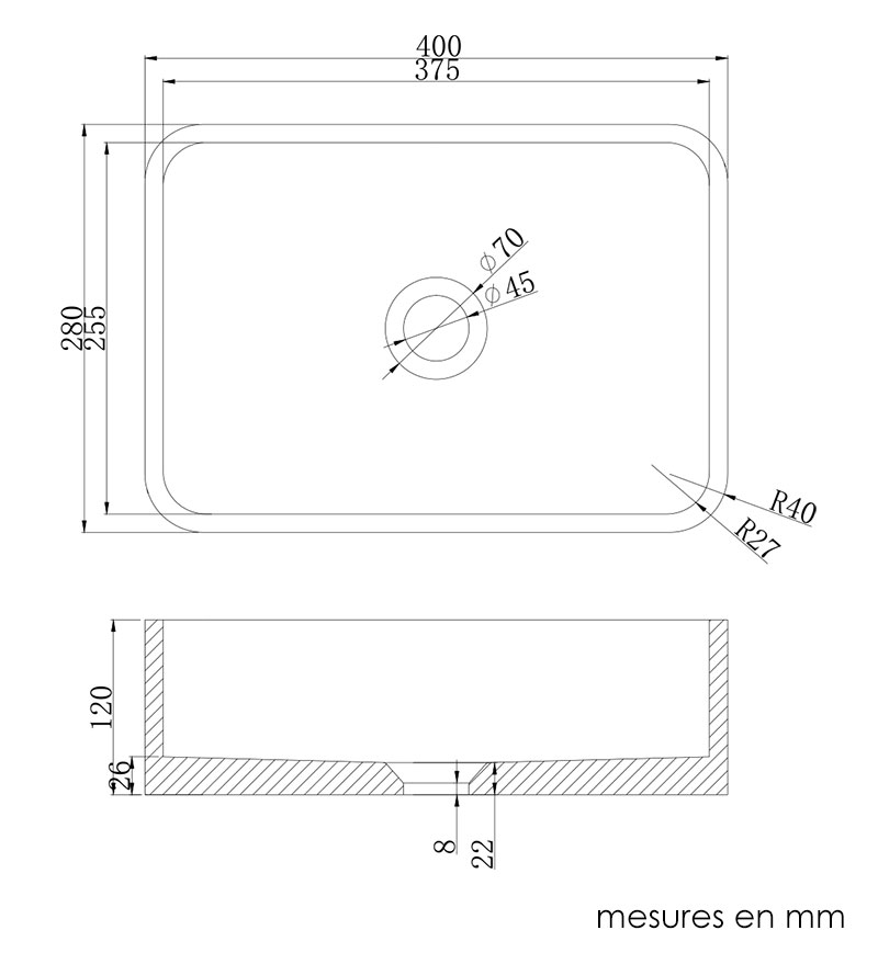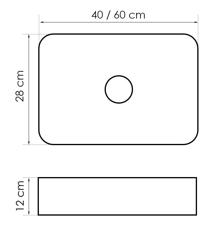 Vasque T4 : l.40xP.28xH.12 cm. Vasque T5 : l.60xP.28xH.12 cm.