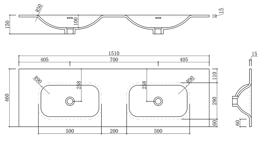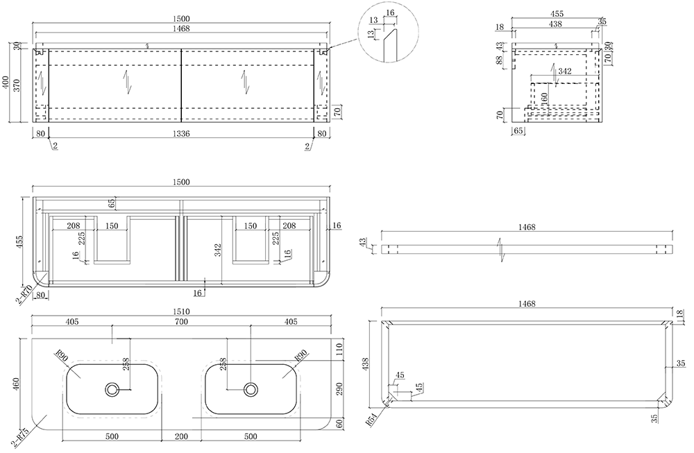 Meuble suspendu 150 cm, placage chêne naturel avec plan vasque en résine minérale blanc mat, Chloé