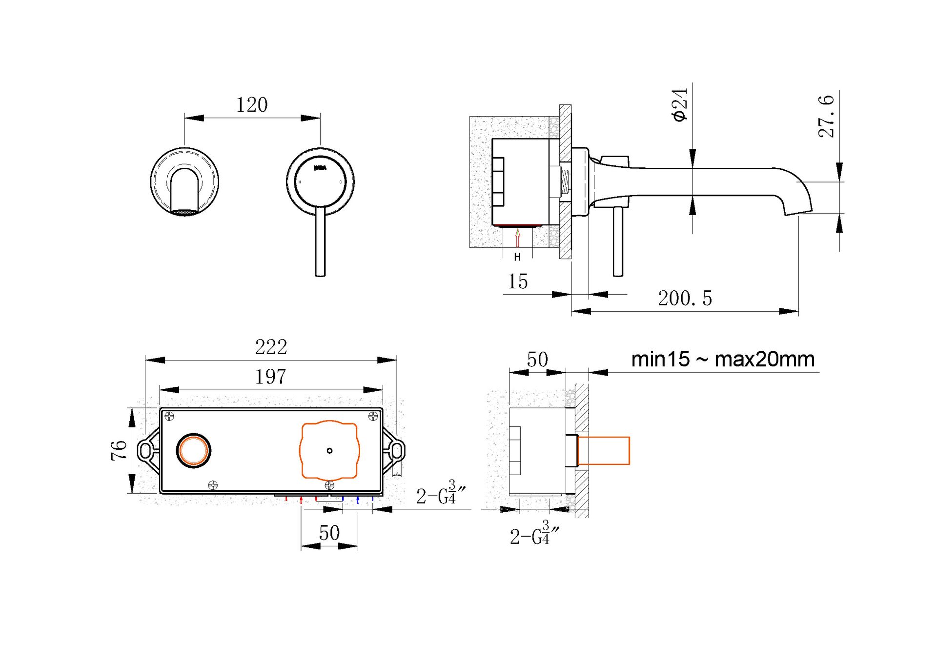 Robinet mitigeur lavabo mural encastré Champagne, Bruma