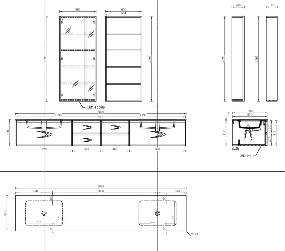 Ensemble meuble salle de bain vasque bois, plan terrazzo, vasque intégrée en céramique, 280x58 cm, étagère et miroir, Tropo