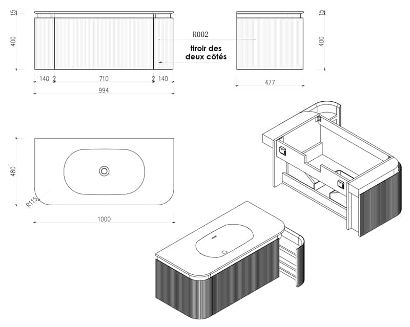 Le corps de ce meuble est réalisé en contreplaqué avec placage noyer cannelé et composé de trois tiroirs. Le plan vasque solid surface blanc n'est pas percé, vous laissant le libre choix du type de robinetterie. Deux tiroirs latéraux et un tiroir tiroir central permettent d'avoir un grand rangement de l'ensemble de vos produits.