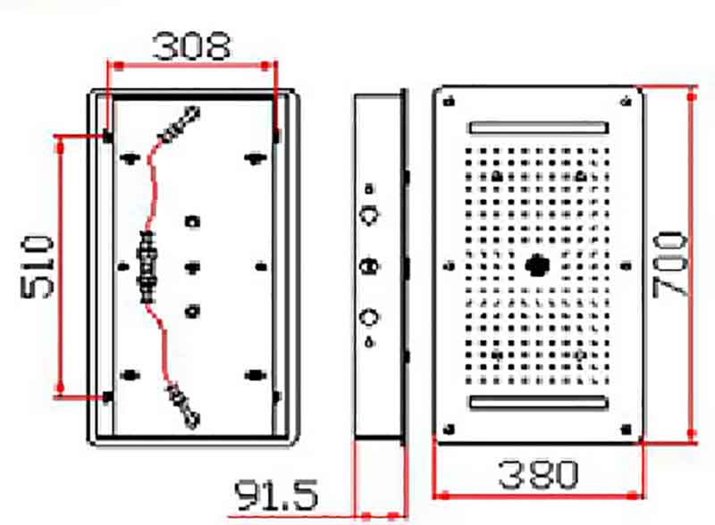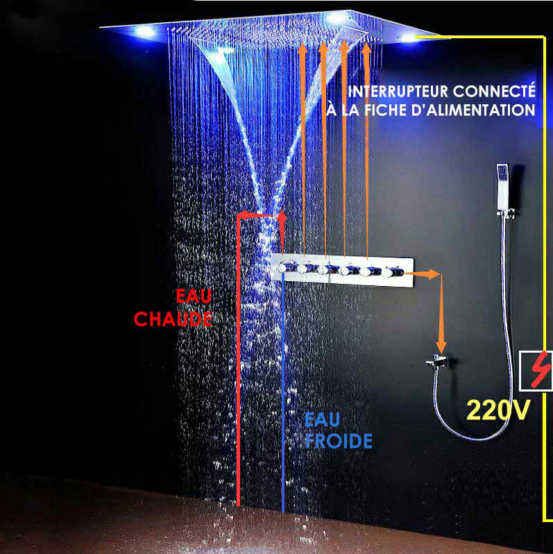 Ce pack de douche comprend : un ciel de pluie encastré 70x38 cm, un panneau de contrôle avec mitigeur thermostatique et 5 inverseurs, un set de douche chromé complet avec douchette et flexible d'1,50 m. Ciel de pluie avec éclairage LED et 4 modes à utiliser séparément ou simultanément pour encore plus de confort (Pluie, Cascade, Brumisateur, Jet hydro central)