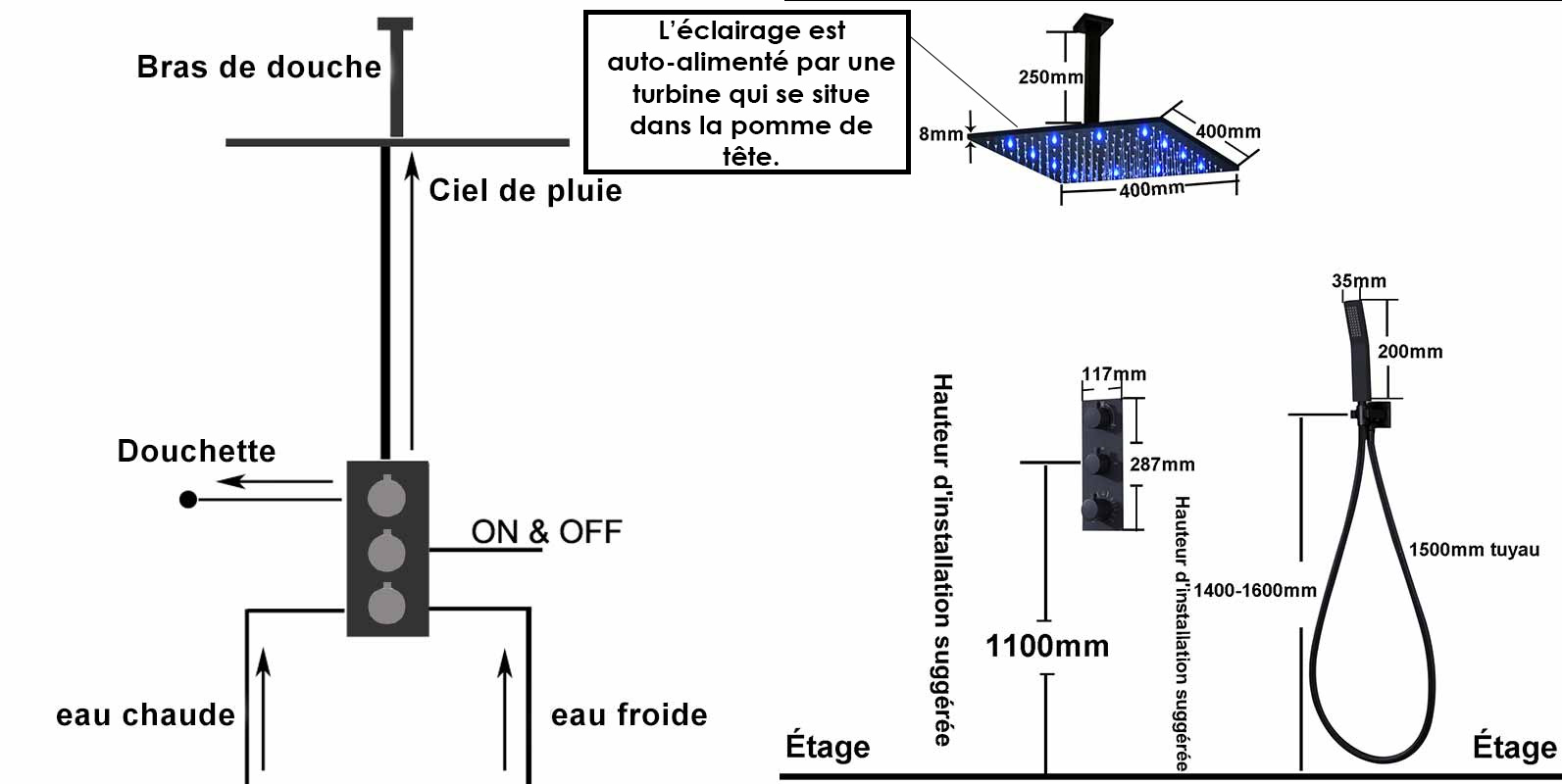 Ce pack de douche comprend : un ciel de pluie 40x40 cm avec son bras de fixation, un mitigeur thermostatique avec contrôle précis de la température, un set de douche chromé complet avec douchette, support avec prise d'eau et flexible d'1,50 m. Ciel de pluie avec système Air et chromothérapie LED 3 couleurs, équipé de picots anti-calcaire. La couleur de l'éclairage varie en fonction de la température de l'eau. L’éclairage est