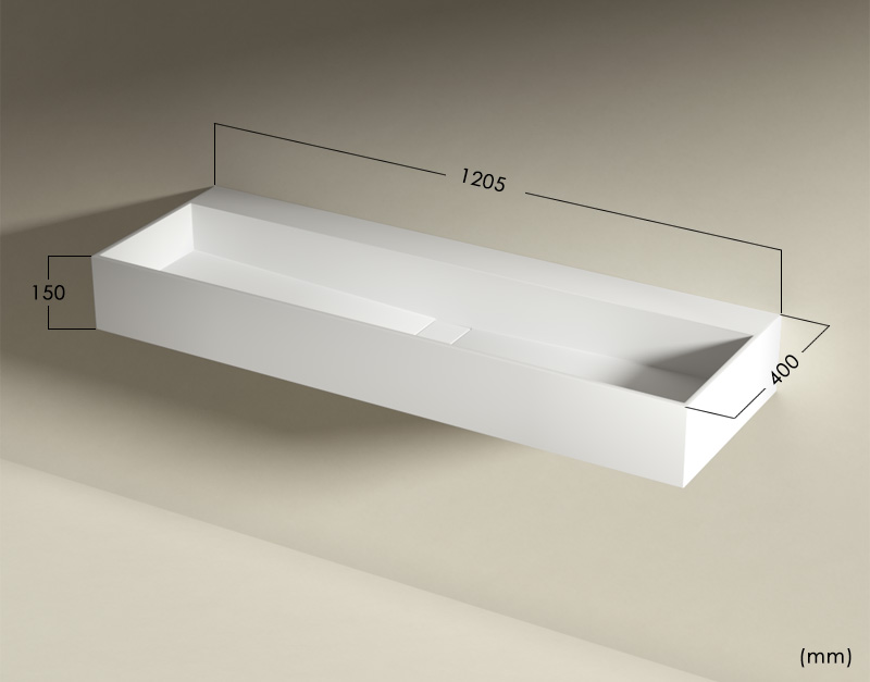 .Avec plage de robinetterie, d'une profondeur de 10 cm. Sans trou de robinetterie. Il est cependant possible de percer le plan avec une scie circulaire disque diamant. Sans trop-plein. Vidage central caché "à lame" bonde à écoulement libre en option. Dimensions : 120,5 x 40 x 15 cm.
