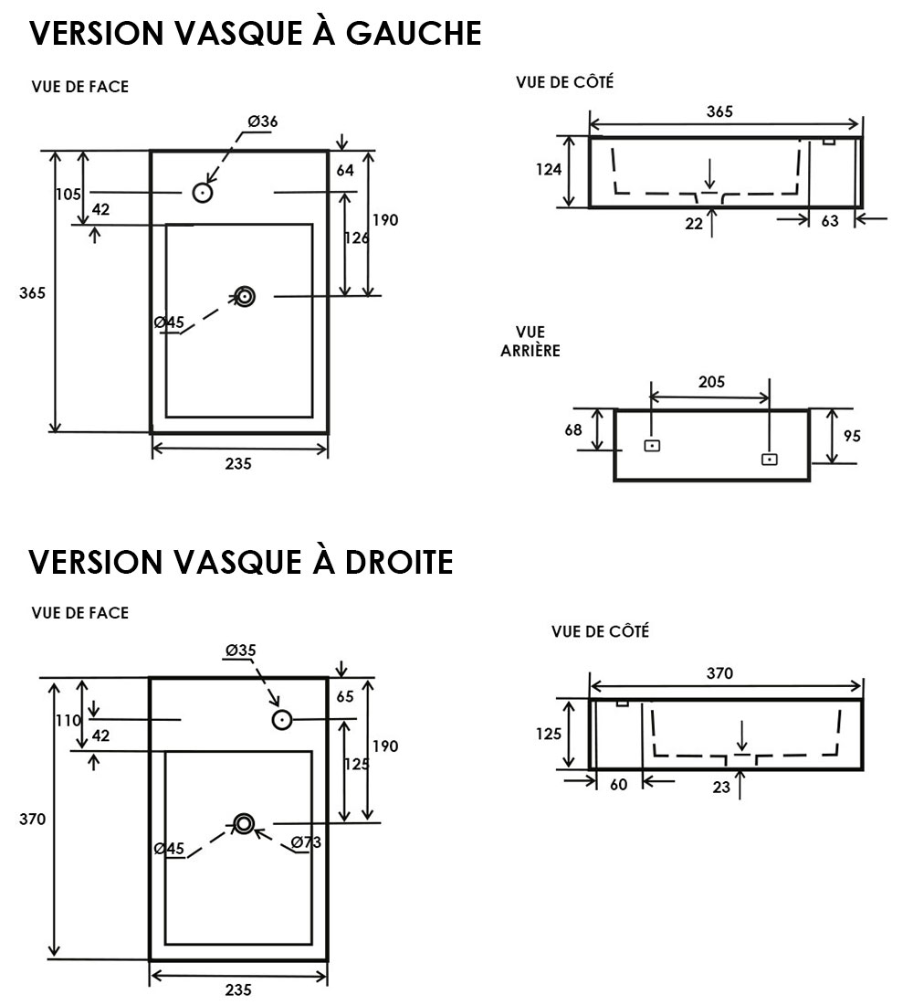 Sans trop-plein. Idéal pour les petites salles de bains ou toilettes. Plage de robinetterie avec percement monotrou, emplacement pour robinetterie à droite ou à gauche.