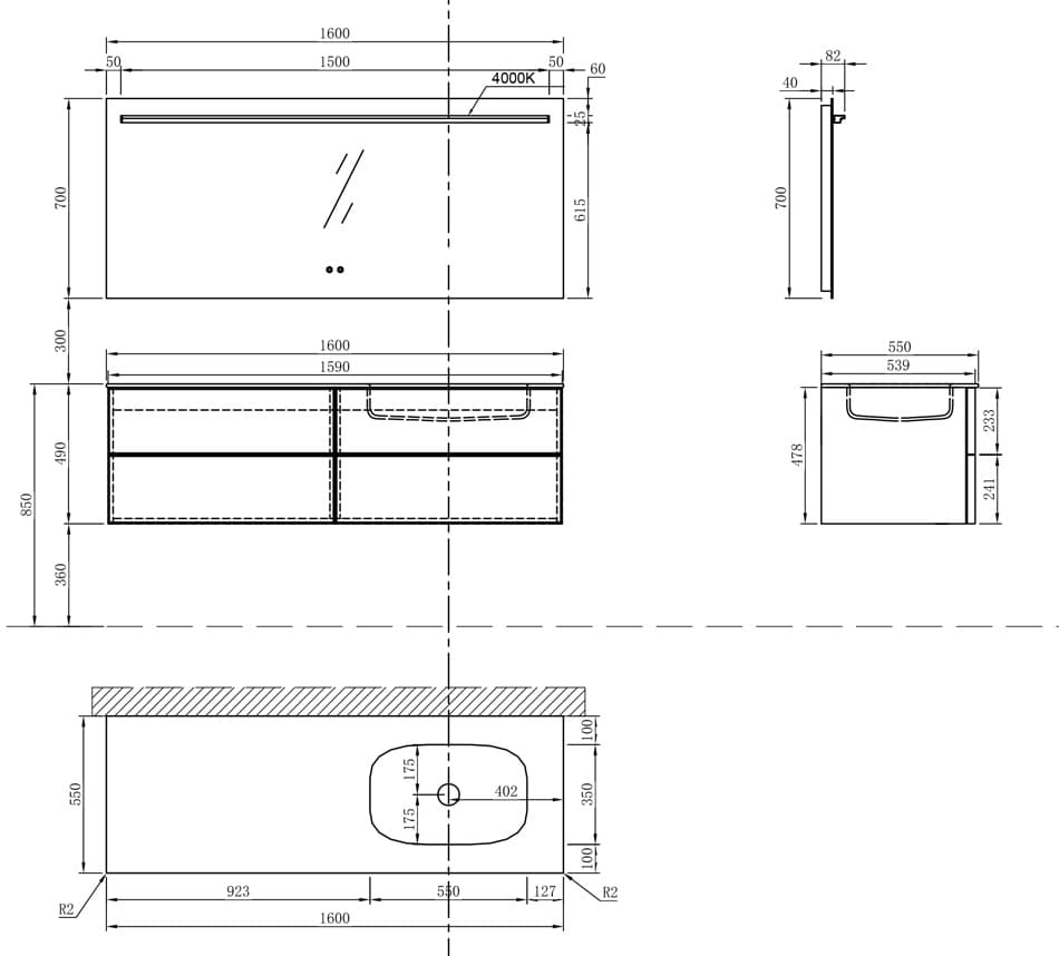 Ensemble meuble salle de bain bois, vasque solid surface, 160x55 miroir et rangement, Mimax