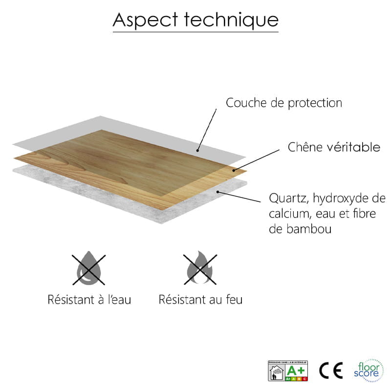 Composé d'eau, de ciment et de fibres de bambou, et d'une couche superficielle de 1 mm en chêne véritable, issu de forêts renouvelables. Ce produit naturel garantit une haute résistance. Facile à installer grâce à son système de clipsage, idéal pour les salles de bain grâce à sa capacité hydrofuge. Innovation écoresponsable. Longueur variable pour un effet naturel : 19 X 51/191. Existe en chêne foncé.