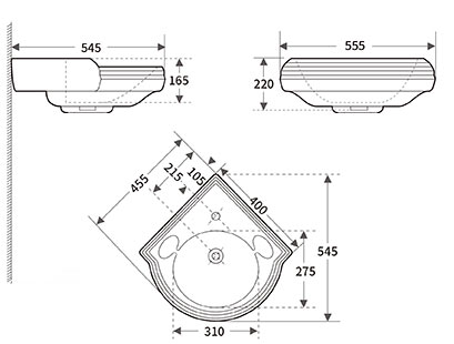 Lave mains d'angle suspendu en céramique blanche de qualité avec trop plein. Permet un gain de place conséquent dans un style intemporel. Bonde, siphon et robinet non inclus.