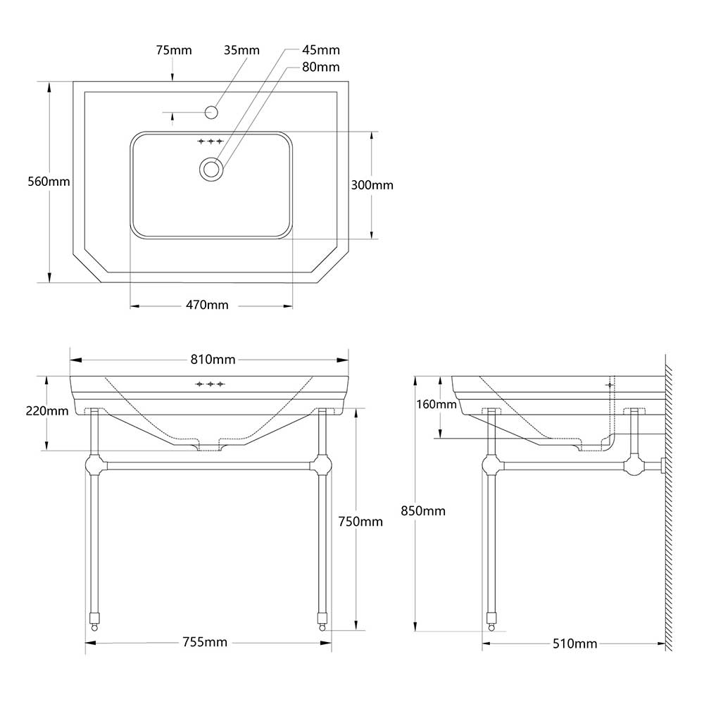 Lavabo console simple, 1 trou, pieds argent, 81 cm, 1920