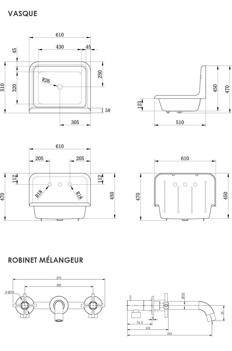 Cette vasque avec dosseret trouvera idéalement sa place dans une salle de bain rétro. Ses lignes courbes et sa large cuve donneront de l'élégance à votre pièce. Installation à poser ou suspendue. Percement 3 trous. Robinet mélangeur Cross inox brossé inclus. Bonde et siphon non fournis. Dimensions : L61 x P51 x H47 cm. Disponible en coloris extérieur noir.