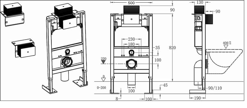 Ce bâti support pour sol ou mur est compatible avec toutes les cuvettes et son installation est possible sur tout type de mur. Grâce à sa hauteur de 82cm, vous pouvez installer des WC suspendus sous une fenêtre ! Pipe coudée et pipe droite Ø 100 mm incluse. Mécanisme compatible Gébérit