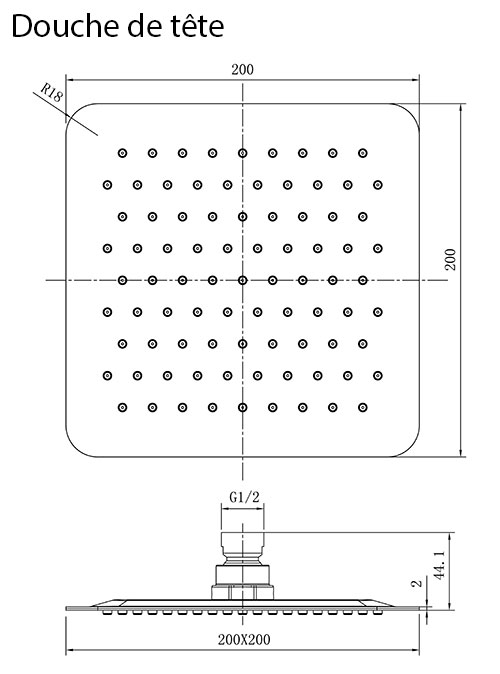 Le pommeau de douche carré Qube est une tête de douche fournie avec un bras de douche plafond. Une pomme de douche idéale pour un bel effet douche de pluie.