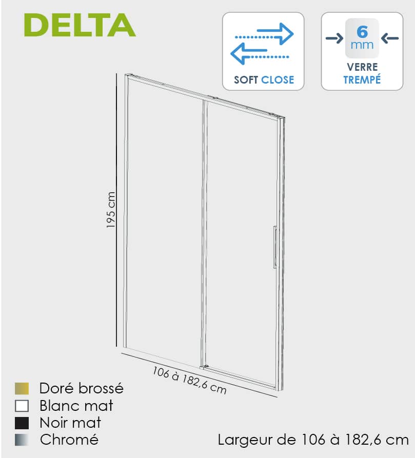 La porte de douche Delta est une porte coulissante avec profilés blanc mat, composé d'une porte coulissante et d'une paroi fixe;