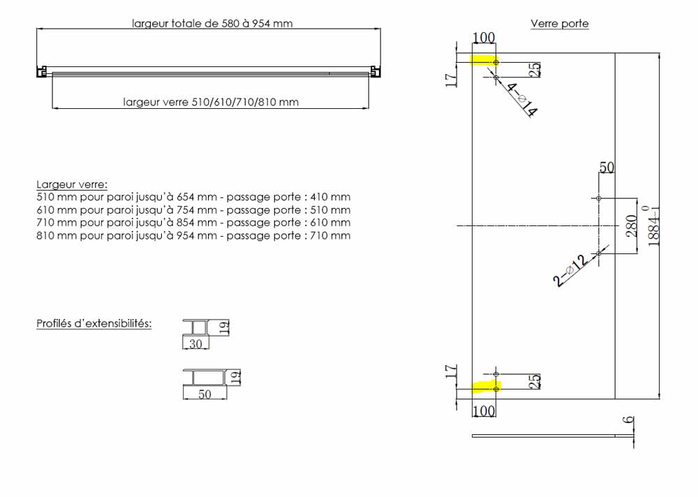 Verre trempé Securit de 6 mm d'épaisseur et traitement anti-calcaire.