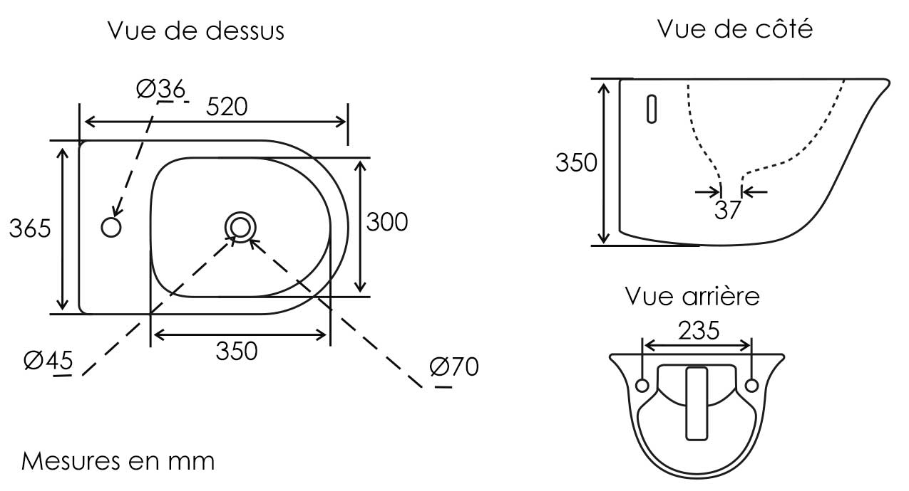 Percement monotrou pour installation de la robinetterie. Equipé d'un trop plein avec cache chromé. Adaptable sur tous les bati-supports standards. Entraxe de fixation 23 cm.