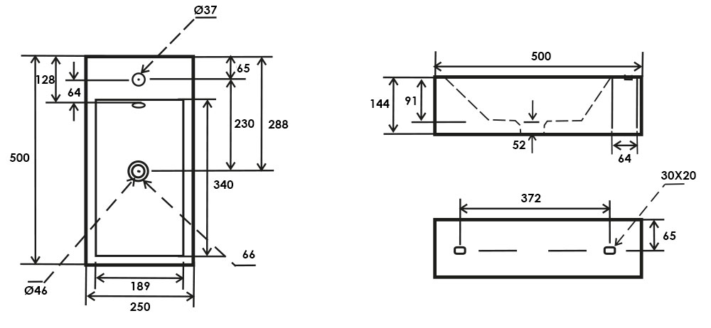 Fixations murales et trop-plein avec cache chromé inclus. Idéal pour les petits espaces. Plage de robinetterie avec percement monotrou.