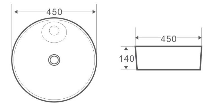 Vasque en céramique à poser ronde avec plage de robinetterie.