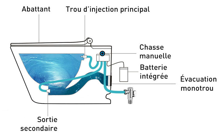 Cuvette WC siphonique suspendue en céramique blanche, W2.0. Le WC qui n'a pas besoin de réservoir ! Idéal pour la rénovation, il lui suffit d'une arrivée d'eau et de l'évacuation. Son système de chasse est commandé par électrovanne. Ultra silencieux. En céramique anti-bactérienne pour un nettoyage simplifié. Bâti-support et abattant thermodur avec système SoftClose inclus. Disponible en version simple ou autoportante. Norme CE. Garantie 5 ans. Diamètre arrivée d'eau 16mm