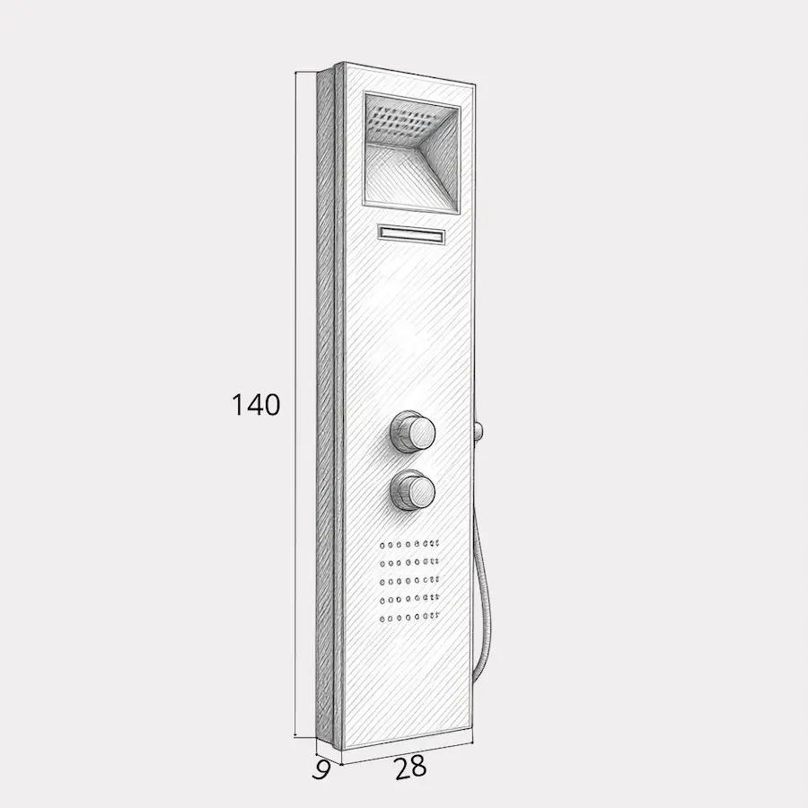 Ce panneau de douche mural est usiné en résine minérale Solid Surface, un matériau massif offrant une finition blanc mat résistante aux rayures et un toucher satiné. La structure intègre de manière encastrée une douche de tête à double fonction pluie et cascade, couplée à deux zones de jets massants frontaux. Mesurant 140 cm de hauteur pour une largeur de 28 cm, cette colonne de douche thermostatique se fixe en applique murale avec une profondeur de saillie de 9 cm. Le système de mitigeur thermostatique contrôle l'arrivée d'eau, tandis que la surface non poreuse de la résine minérale garantit un entretien direct et limite l'accumulation de calcaire.
