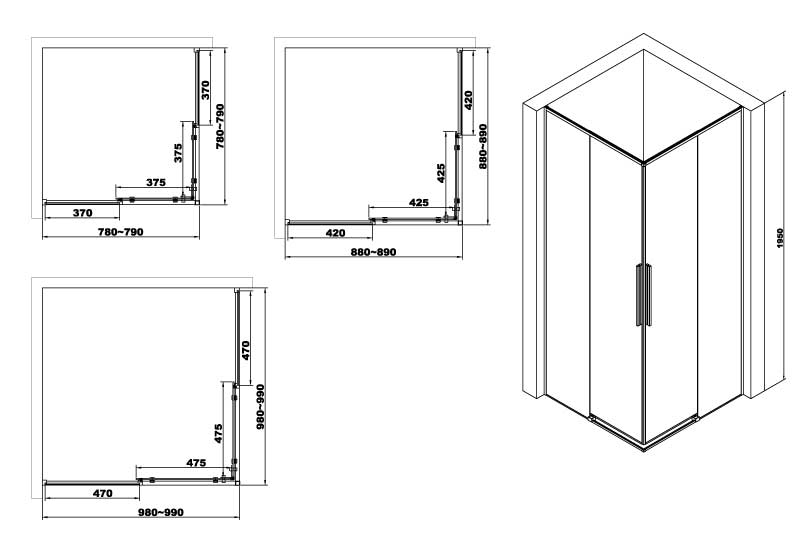 Cette cabine à ouverture centrale se compose de deux parois fixes et deux portes coulissantes. Elle est fabriquée en verre trempé Securit de 6mm.